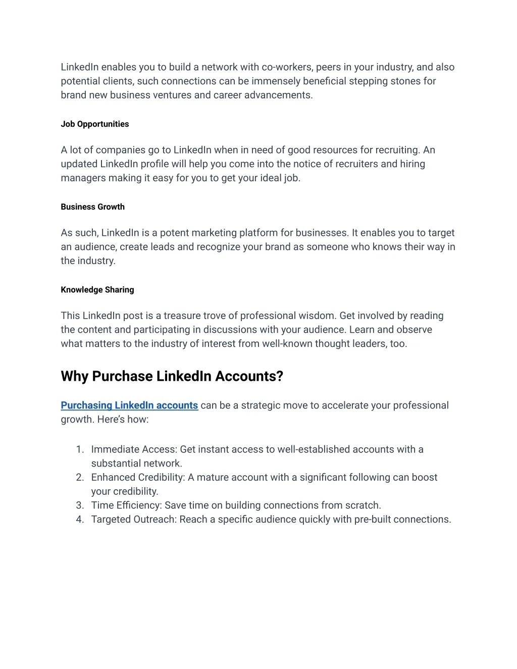 LinkedIn enables you to build a network with co-workers, peers in your industry, and also potential clients, such connections can be immensely beneficial stepping stones for brand new business ventures and career advancements. Job Opportunities A lot of companies go to LinkedIn when in need of good resources for recruiting. An updated LinkedIn profile will help you come into the notice of recruiters and hiring managers making it easy for you to get your ideal job. Business Growth As such, LinkedIn is a potent marketing platform for businesses. It enables you to target an audience, create leads and recognize your brand as someone who knows their way in the industry. Knowledge Sharing This LinkedIn post is a treasure trove of professional wisdom. Get involved by reading the content and participating in discussions with your audience. Learn and observe what matters to the industry of interest from well-known thought leaders, too. Why Purchase LinkedIn Accounts? Purchasing LinkedIn accounts can be a strategic move to accelerate your professional growth. Here’s how: 1. Immediate Access: Get instant access to well-established accounts with a substantial network. 2. Enhanced Credibility: A mature account with a significant following can boost your credibility. 3. Time Efficiency: Save time on building connections from scratch. 4. Targeted Outreach: Reach a specific audience quickly with pre-built connections.