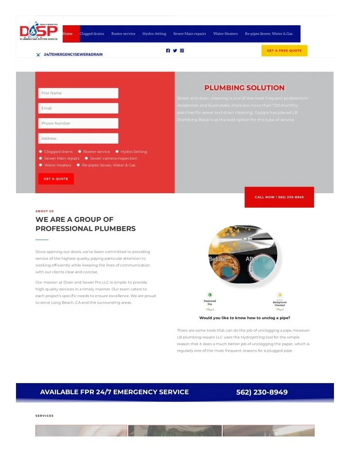Home Clogged drains Rooter service Hydro-Jetting Sewer Main repairs Water Heaters Re-pipes Sewer, Water & Gas. GET A FREE QUOTE 24/7EMERGENCYSEWER&DRAIN PLUMBING SOLUTION PLUMBING SOLUTION First Name Sewer and drain cleaning is one of the most frequent problems in residences and businesses, there are more than 720 monthly Email searches for sewer and drain cleaning, Google has placed LB Plumbing Repairs as the best option for this type of service. Phone Number Address Clogged drains Rooter service Hydro-Jetting Sewer Main repairs Sewer camera inspection Water Heaters Re-pipes Sewer, Water & Gas GET A QUOTE CALL NOW ! 562) 230-8949 ABOUT US WE ARE A GROUP OF PROFESSIONAL PLUMBERS Since opening our doors, we’ve been committed to providing service of the highest quality, paying particular attention to working ef?ciently while keeping the lines of communication with our clients clear and concise. Our mission at Drain and Sewer Pro LLC is simple: to provide high-quality services in a timely manner. Our team caters to each project’s speci?c needs to ensure excellence. We are proud to serve Long Beach, CA and the surrounding areas. Would you like to know how to unclog a pipe? There are some tools that can do the job of unclogging a pipe, however LB plumbing repairs LLC uses the Hydrojetting tool for the simple reason that it does a much better job of unclogging the paper, which is regularly one of the most frequent reasons for a plugged pipe. AVAILABLE FPR 24/7 EMERGENCY SERVICE 562) 230-8949 SERVICES