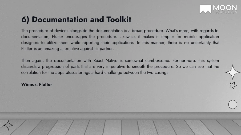 6) Documentation and Toolkit The procedure of devices alongside the documentation is a broad procedure. What’s more, with regards to documentation, Flutter encourages the procedure. Likewise, it makes it simpler for mobile application designers to utilize them while reporting their applications. In this manner, there is no uncertainty that Flutter is an amazing alternative against its partner. Then again, the documentation with React Native is somewhat cumbersome. Furthermore, this system discards a progression of parts that are very imperative to smooth the procedure. So we can see that the correlation for the apparatuses brings a hard challenge between the two casings. Winner: Flutter