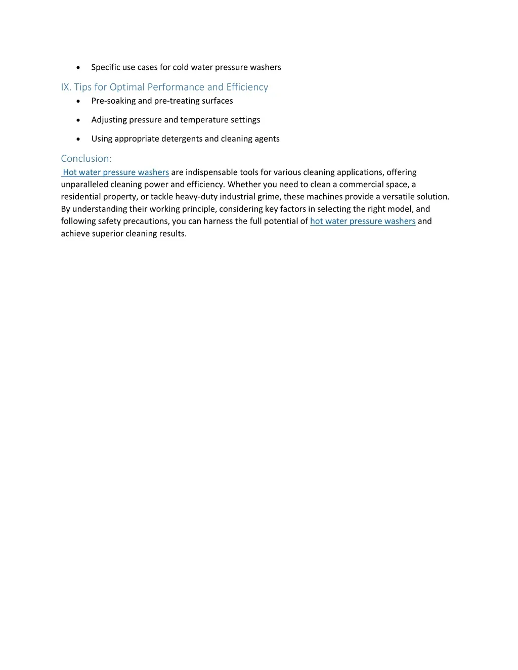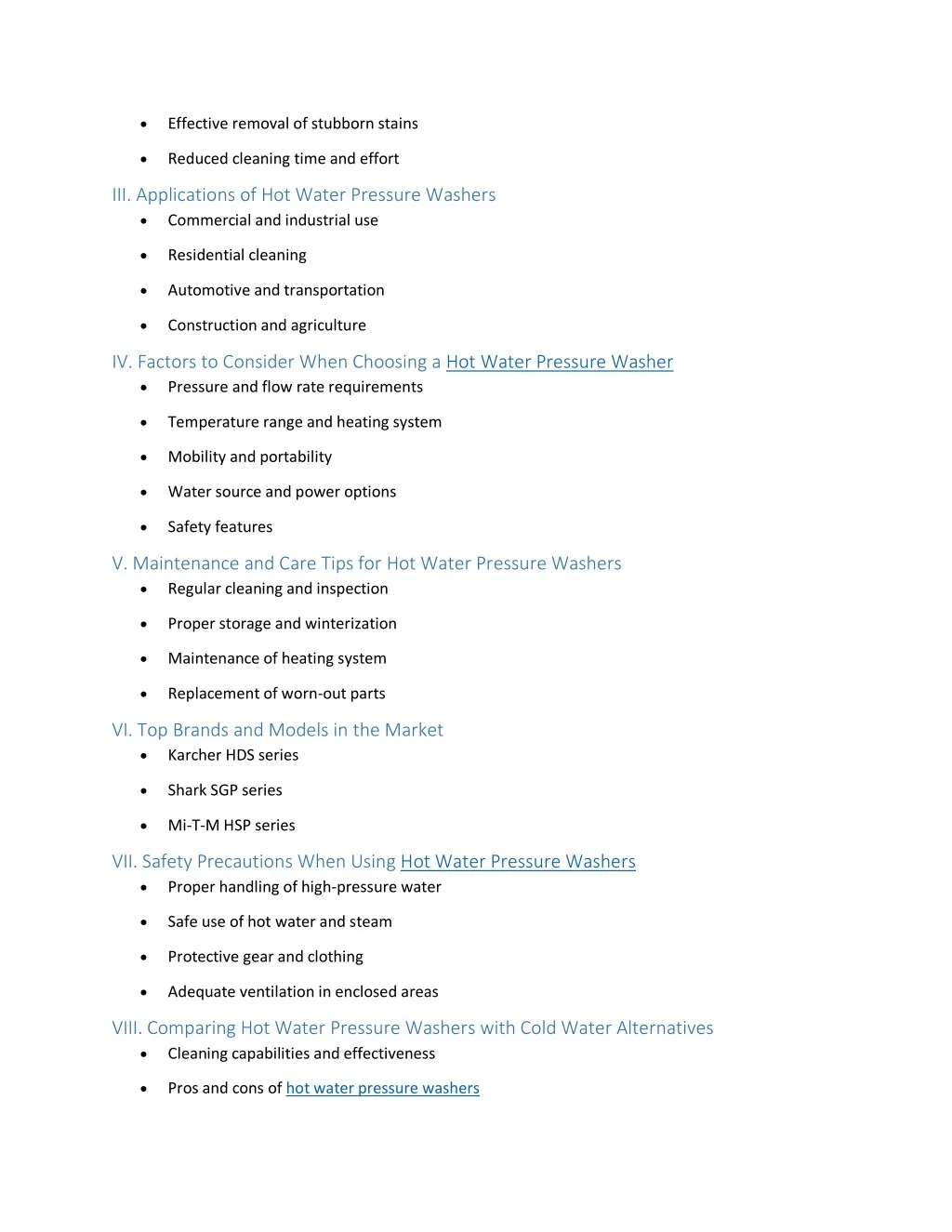 Effective removal of stubborn stains Reduced cleaning time and effort III. Applications of Hot Water Pressure Washers Commercial and industrial use Residential cleaning Automotive and transportation Construction and agriculture IV. Factors to Consider When Choosing a Hot Water Pressure Washer Pressure and flow rate requirements Temperature range and heating system Mobility and portability Water source and power options Safety features V. Maintenance and Care Tips for Hot Water Pressure Washers Regular cleaning and inspection Proper storage and winterization Maintenance of heating system Replacement of worn-out parts VI. Top Brands and Models in the Market Karcher HDS series Shark SGP series Mi-T-M HSP series VII. Safety Precautions When Using Hot Water Pressure Washers Proper handling of high-pressure water Safe use of hot water and steam Protective gear and clothing Adequate ventilation in enclosed areas VIII. Comparing Hot Water Pressure Washers with Cold Water Alternatives Cleaning capabilities and effectiveness Pros and cons of hot water pressure washers