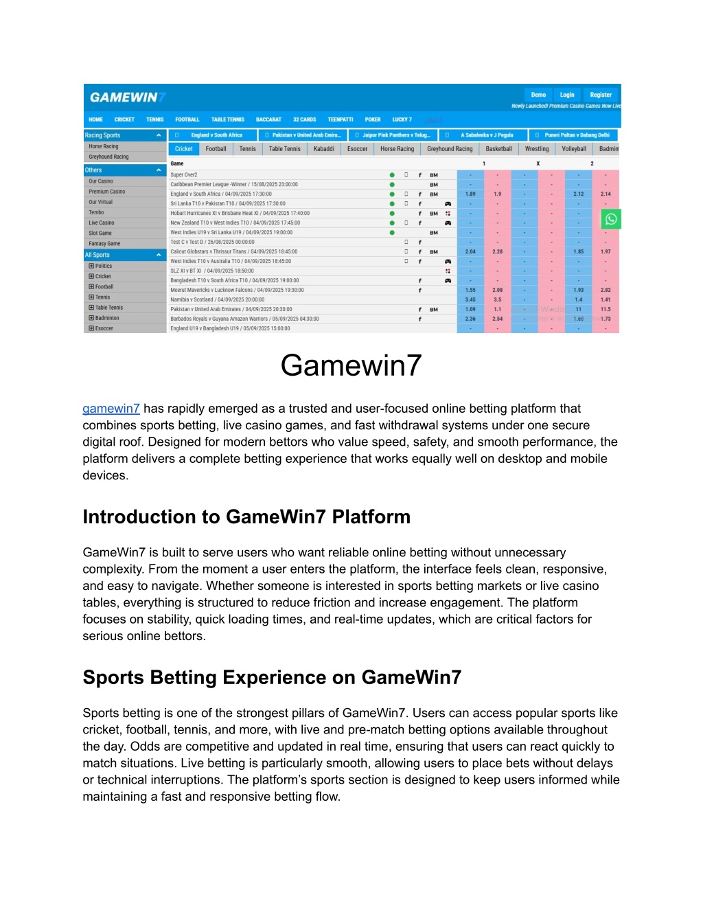 Gamewin7 gamewin7 has rapidly emerged as a trusted and user-focused online betting platform that combines sports betting, live casino games, and fast withdrawal systems under one secure digital roof. Designed for modern bettors who value speed, safety, and smooth performance, the platform delivers a complete betting experience that works equally well on desktop and mobile devices. Introduction to GameWin7 Platform GameWin7 is built to serve users who want reliable online betting without unnecessary complexity. From the moment a user enters the platform, the interface feels clean, responsive, and easy to navigate. Whether someone is interested in sports betting markets or live casino tables, everything is structured to reduce friction and increase engagement. The platform focuses on stability, quick loading times, and real-time updates, which are critical factors for serious online bettors. Sports Betting Experience on GameWin7 Sports betting is one of the strongest pillars of GameWin7. Users can access popular sports like cricket, football, tennis, and more, with live and pre-match betting options available throughout the day. Odds are competitive and updated in real time, ensuring that users can react quickly to match situations. Live betting is particularly smooth, allowing users to place bets without delays or technical interruptions. The platform’s sports section is designed to keep users informed while maintaining a fast and responsive betting flow.