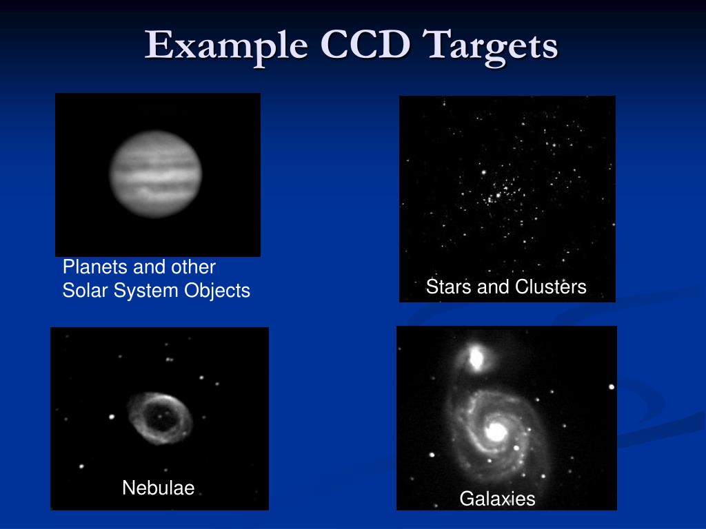 Example CCD Targets Planets and other Solar System Objects Stars and Clusters Nebulae Galaxies