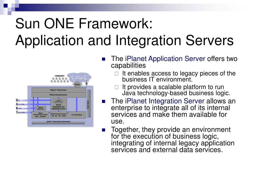 Sun ONE Framework: Application and Integration Servers • The iPlanet Application Server offers two capabilities • It enables access to legacy pieces of the business IT environment. • It provides a scalable platform to run Java technology-based business logic. • The iPlanet Integration Server allows an enterprise to integrate all of its internal services and make them available for use. • Together, they provide an environment for the execution of business logic, integrating of internal legacy application services and external data services.