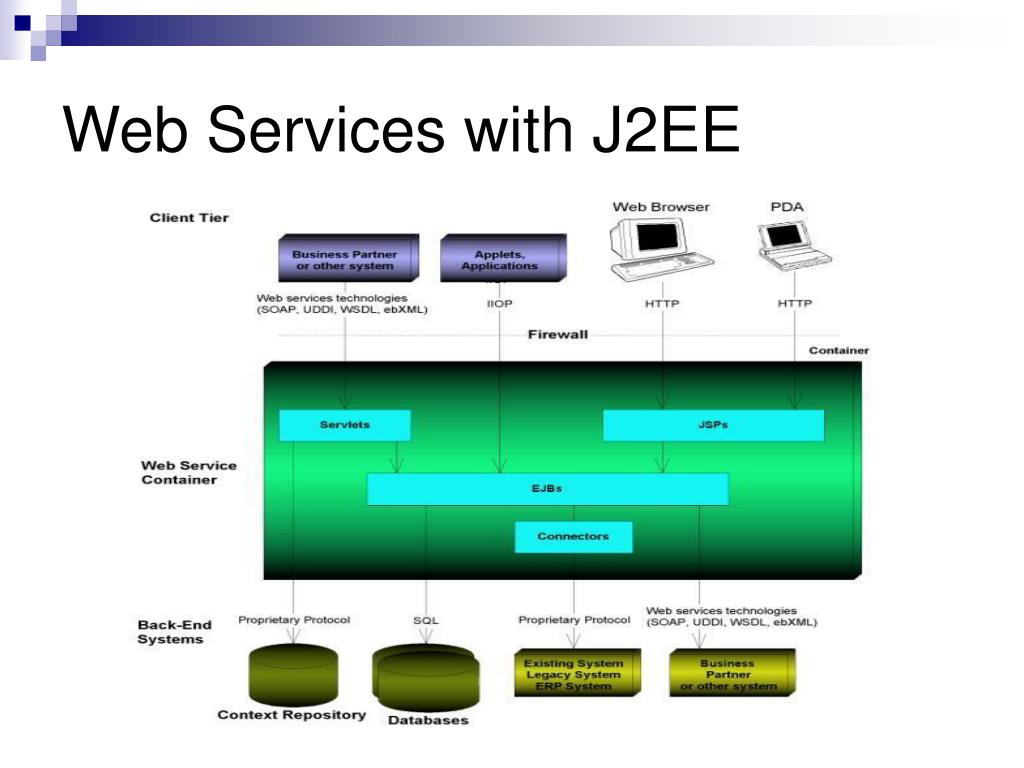 Web Services with J2EE • It connects to databases using Java Database Connectivity (JDBC) or SQL/J, or existing systems using the Java Connector Architecture (JCA). • It can also connect to business partners using web services technologies (SOAP, UDDI, WSDL, ebXML) through the Java APIs for XML (the JAX APIs).