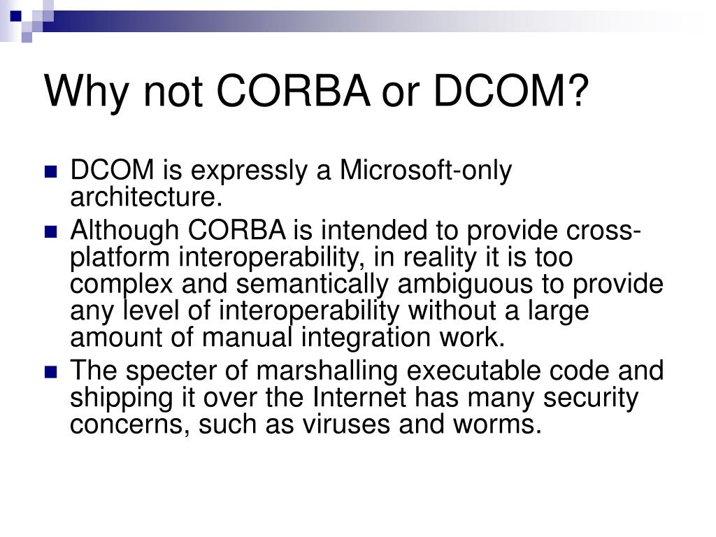 Why not CORBA or DCOM? • DCOM is expressly a Microsoft-only architecture. • Although CORBA is intended to provide cross-platform interoperability, in reality it is too complex and semantically ambiguous to provide any level of interoperability without a large amount of manual integration work. • The specter of marshalling executable code and shipping it over the Internet has many security concerns, such as viruses and worms.