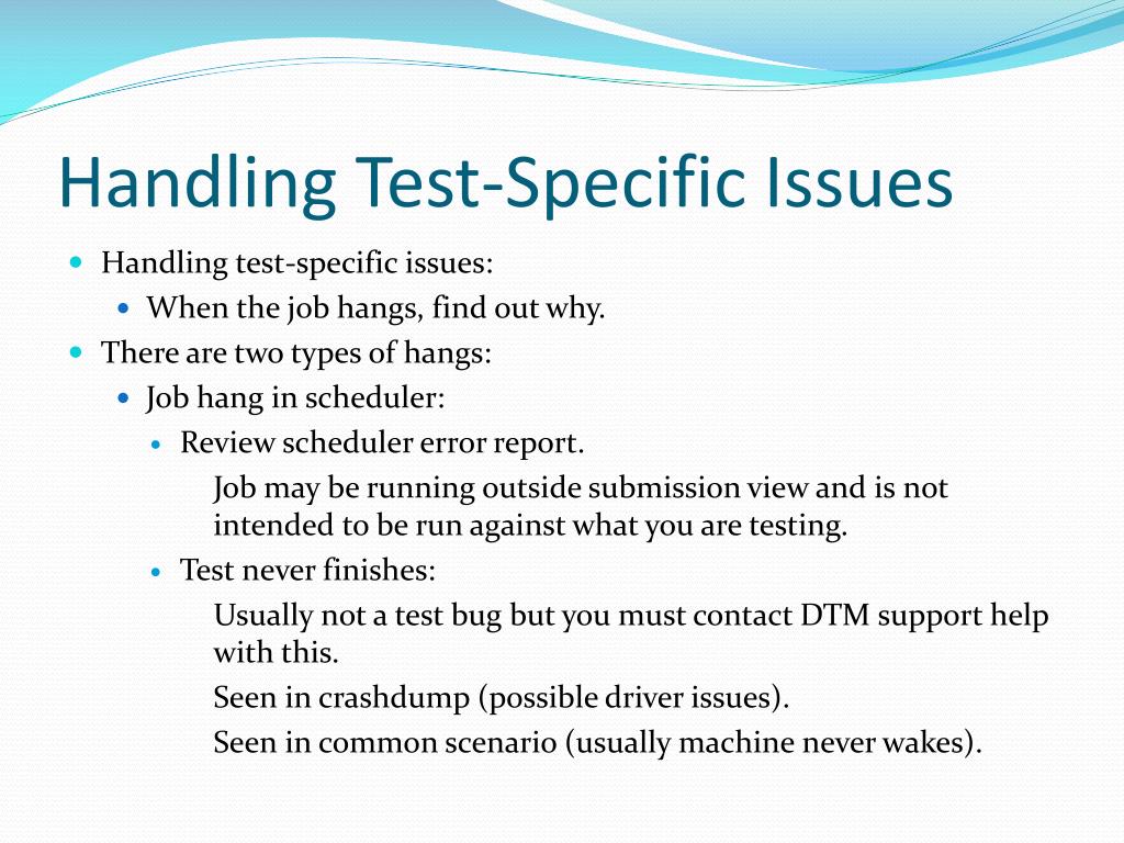 Handling Test-Specific Issues • Handling test-specific issues: • When the job hangs, find out why. • There are two types of hangs: • Job hang in scheduler: • Review scheduler error report. Job may be running outside submission view and is not intended to be run against what you are testing. • Test never finishes: Usually not a test bug but you must contact DTM support help with this. Seen in crashdump (possible driver issues). Seen in common scenario (usually machine never wakes).