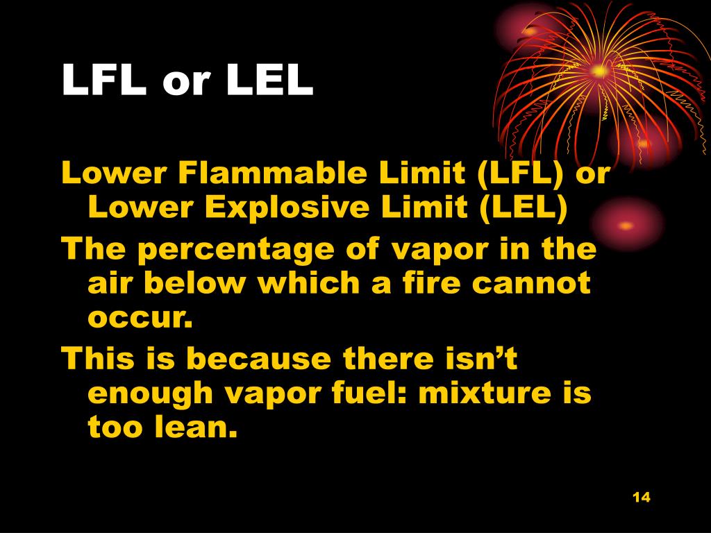 LFL or LEL Lower Flammable Limit (LFL) or Lower Explosive Limit (LEL) The percentage of vapor in the air below which a fire cannot occur. This is because there isn’t enough vapor fuel: mixture is too lean.