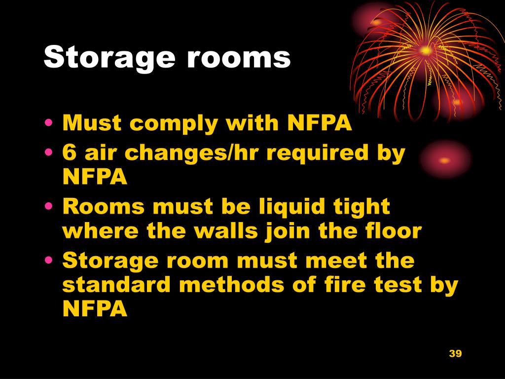 Storage rooms • Must comply with NFPA • 6 air changes/hr required by NFPA • Rooms must be liquid tight where the walls join the floor • Storage room must meet the standard methods of fire test by NFPA