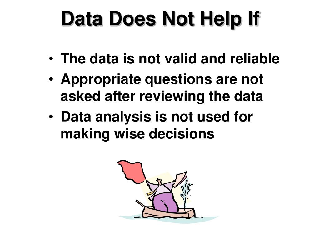 Data Does Not Help If • The data is not valid and reliable • Appropriate questions are not asked after reviewing the data • Data analysis is not used for making wise decisions