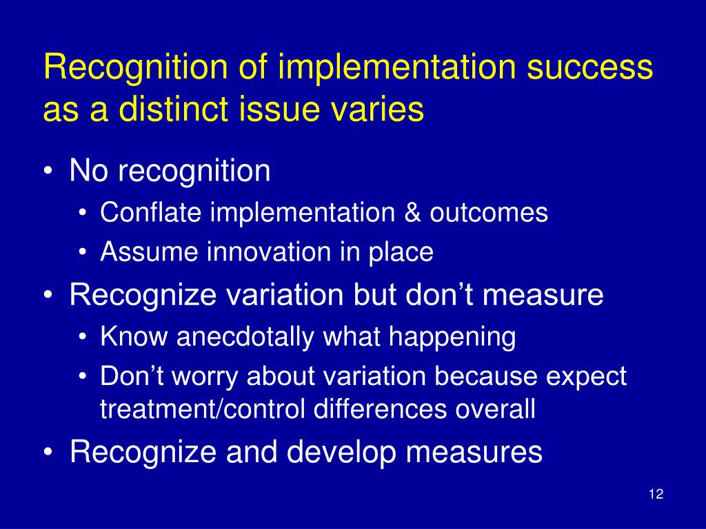 Recognition of implementation success as a distinct issue varies • No recognition • Conflate implementation & outcomes • Assume innovation in place • Recognize variation but don’t measure • Know anecdotally what happening • Don’t worry about variation because expect treatment/control differences overall • Recognize and develop measures