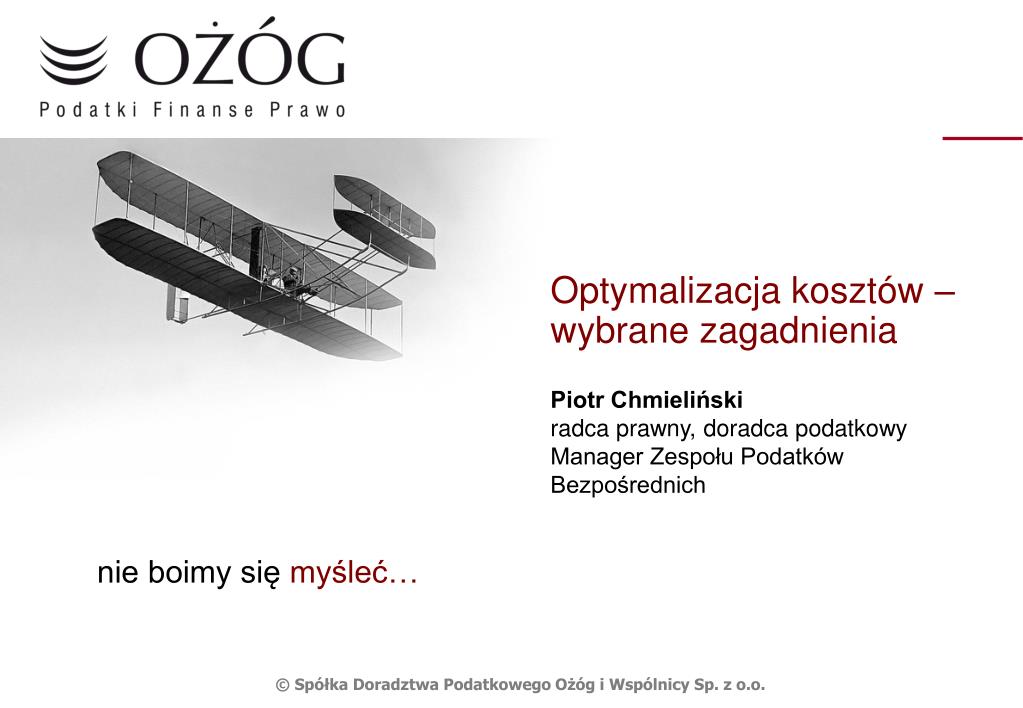 Optymalizacja kosztów –wybrane zagadnienia • Piotr Chmieliński • radca prawny, doradca podatkowy • Manager Zespołu Podatków Bezpośrednich nie boimy się myśleć… © Spółka Doradztwa Podatkowego Ożóg i Wspólnicy Sp. z o.o.