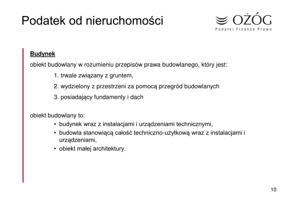 Podatek od nieruchomości Budynek obiekt budowlany w rozumieniu przepisów prawa budowlanego, który jest: • trwale związany z gruntem, • wydzielony z przestrzeni za pomocą przegród budowlanych • posiadający fundamenty i dach obiekt budowlany to: • budynek wraz z instalacjami i urządzeniami technicznymi, • budowla stanowiącą całość techniczno-użytkową wraz z instalacjami i urządzeniami, • obiekt małej architektury.
