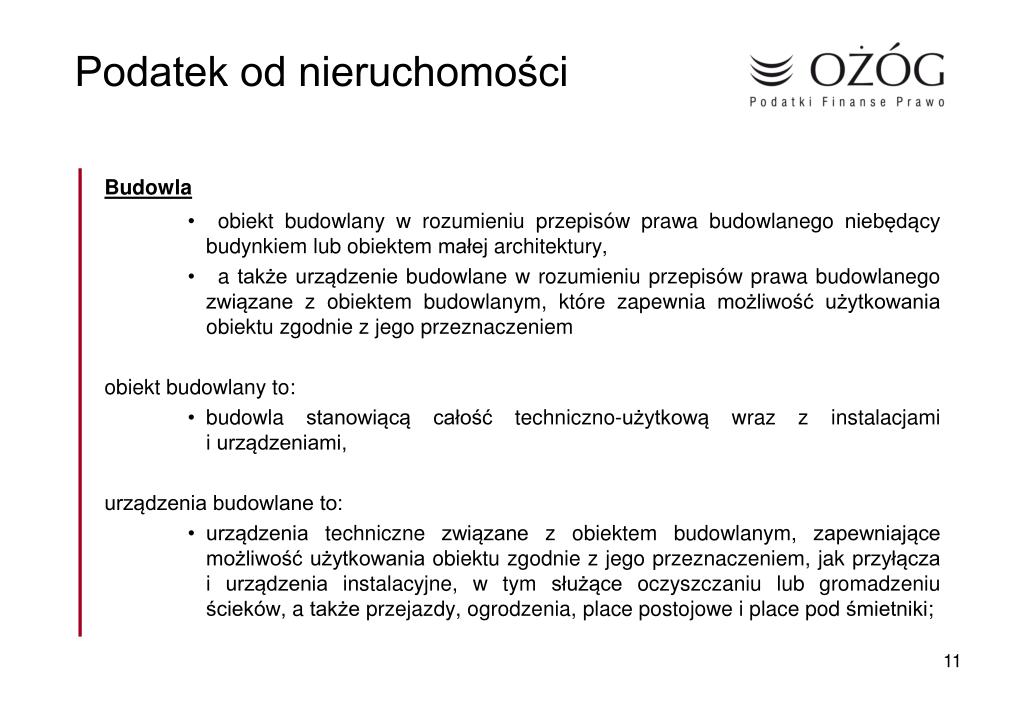 Podatek od nieruchomości Budowla • obiekt budowlany w rozumieniu przepisów prawa budowlanego niebędący budynkiem lub obiektem małej architektury, • a także urządzenie budowlane w rozumieniu przepisów prawa budowlanego związane z obiektem budowlanym, które zapewnia możliwość użytkowania obiektu zgodnie z jego przeznaczeniem obiekt budowlany to: • budowla stanowiącą całość techniczno-użytkową wraz z instalacjami i urządzeniami, urządzenia budowlane to: • urządzenia techniczne związane z obiektem budowlanym, zapewniające możliwość użytkowania obiektu zgodnie z jego przeznaczeniem, jak przyłącza i urządzenia instalacyjne, w tym służące oczyszczaniu lub gromadzeniu ścieków, a także przejazdy, ogrodzenia, place postojowe i place pod śmietniki;