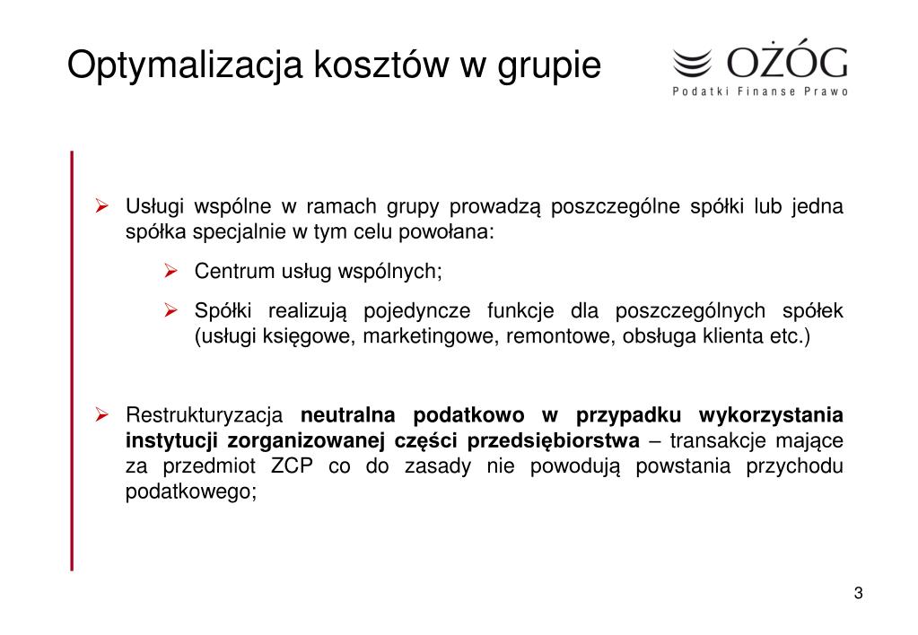 Optymalizacja kosztów w grupie • Usługi wspólne w ramach grupy prowadzą poszczególne spółki lub jedna spółka specjalnie w tym celu powołana: • Centrum usług wspólnych; • Spółki realizują pojedyncze funkcje dla poszczególnych spółek (usługi księgowe, marketingowe, remontowe, obsługa klienta etc.) • Restrukturyzacja neutralna podatkowo w przypadku wykorzystania instytucji zorganizowanej części przedsiębiorstwa – transakcje mające za przedmiot ZCP co do zasady nie powodują powstania przychodu podatkowego;