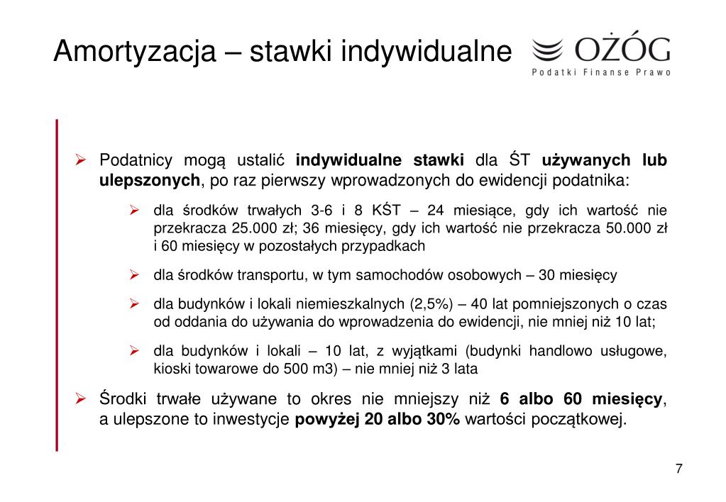 Amortyzacja – stawki indywidualne • Podatnicy mogą ustalić indywidualne stawki dla ŚT używanych lub ulepszonych, po raz pierwszy wprowadzonych do ewidencji podatnika: • dla środków trwałych 3-6 i 8 KŚT – 24 miesiące, gdy ich wartość nie przekracza 25.000 zł; 36 miesięcy, gdy ich wartość nie przekracza 50.000 zł i 60 miesięcy w pozostałych przypadkach • dla środków transportu, w tym samochodów osobowych – 30 miesięcy • dla budynków i lokali niemieszkalnych (2,5%) – 40 lat pomniejszonych o czas od oddania do używania do wprowadzenia do ewidencji, nie mniej niż 10 lat; • dla budynków i lokali – 10 lat, z wyjątkami (budynki handlowo usługowe, kioski towarowe do 500 m3) – nie mniej niż 3 lata • Środki trwałe używane to okres nie mniejszy niż 6 albo 60 miesięcy, a ulepszone to inwestycje powyżej 20 albo 30% wartości początkowej.
