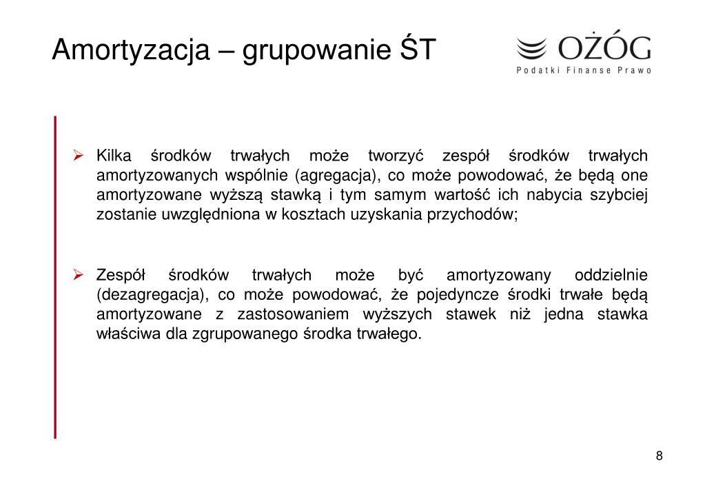 Amortyzacja – grupowanie ŚT • Kilka środków trwałych może tworzyć zespół środków trwałych amortyzowanych wspólnie (agregacja), co może powodować, że będą one amortyzowane wyższą stawką i tym samym wartość ich nabycia szybciej zostanie uwzględniona w kosztach uzyskania przychodów; • Zespół środków trwałych może być amortyzowany oddzielnie (dezagregacja), co może powodować, że pojedyncze środki trwałe będą amortyzowane z zastosowaniem wyższych stawek niż jedna stawka właściwa dla zgrupowanego środka trwałego.