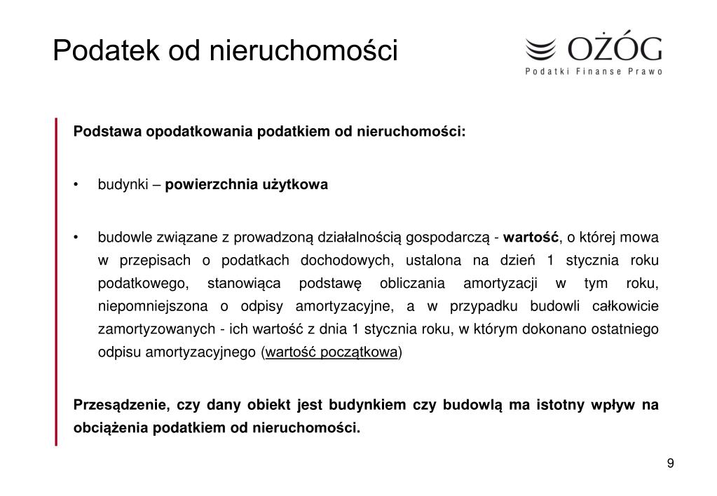 Podatek od nieruchomości Podstawa opodatkowania podatkiem od nieruchomości: • budynki – powierzchnia użytkowa • budowle związane z prowadzoną działalnością gospodarczą - wartość, o której mowa w przepisach o podatkach dochodowych, ustalona na dzień 1 stycznia roku podatkowego, stanowiąca podstawę obliczania amortyzacji w tym roku, niepomniejszona o odpisy amortyzacyjne, a w przypadku budowli całkowicie zamortyzowanych - ich wartość z dnia 1 stycznia roku, w którym dokonano ostatniego odpisu amortyzacyjnego (wartość początkowa) Przesądzenie, czy dany obiekt jest budynkiem czy budowlą ma istotny wpływ na obciążenia podatkiem od nieruchomości.