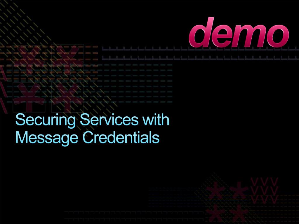 Transport With Message Credential Mode <soap:Envelope> <soap:Header><!-- WS-Security Header --> <!-- With UserName, Password, Timestamp --> </soap:Header> <soap:Body><!-- Message Payload --></soap:Body> </soap:Envelope> • Plain-text password sent over the wire • Requires SSL (HTTPS). Restriction is enforced • Timestamp, Lifetime, Max Clock Skew • Simple replay protection • Enforced in both directions (client server) • Default max skew is 5 minutes – may require changes(Client clock can’t be more that 5 minutes out of sync with server)
