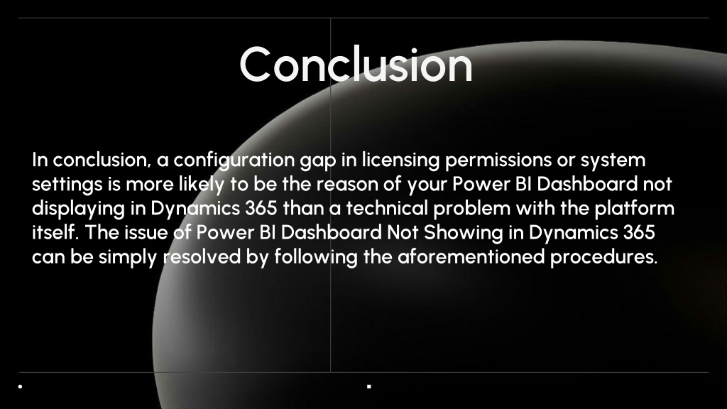 10. Conclusion In conclusion, a configuration gap in licensing permissions or system settings is more likely to be the reason of your Power BI Dashboard not displaying in Dynamics 365 than a technical problem with the platform itself. The issue of Power BI Dashboard Not Showing in Dynamics 365 can be simply resolved by following the aforementioned procedures.