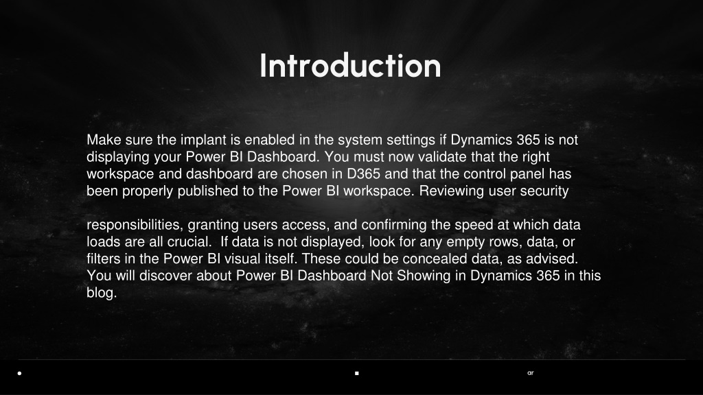 3. Make sure the implant is enabled in the system settings if Dynamics 365 is not displaying your Power BI Dashboard. You must now validate that the right workspace and dashboard are chosen in D365 and that the control panel has been properly published to the Power BI workspace. Reviewing user security responsibilities, granting users access, and confirming the speed at which data loads are all crucial. If data is not displayed, look for any empty rows, data, or filters in the Power BI visual itself. These could be concealed data, as advised. You will discover about Power BI Dashboard Not Showing in Dynamics 365 in this blog. Introduction ar
