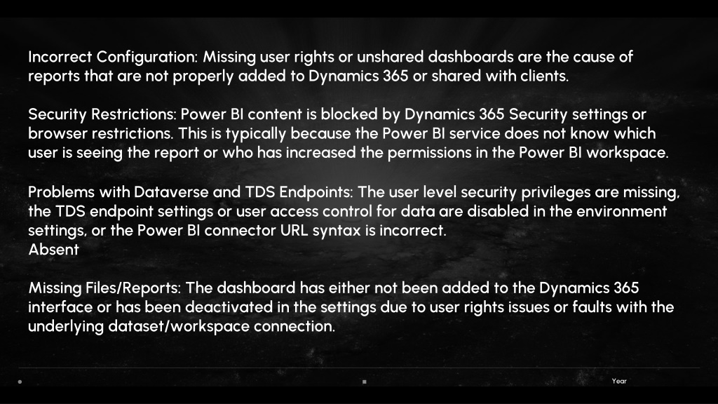 9. Incorrect Configuration: Missing user rights or unshared dashboards are the cause of reports that are not properly added to Dynamics 365 or shared with clients. Security Restrictions: Power BI content is blocked by Dynamics 365 Security settings or browser restrictions. This is typically because the Power BI service does not know which user is seeing the report or who has increased the permissions in the Power BI workspace. Problems with Dataverse and TDS Endpoints: The user level security privileges are missing, the TDS endpoint settings or user access control for data are disabled in the environment settings, or the Power BI connector URL syntax is incorrect. Absent Missing Files/Reports: The dashboard has either not been added to the Dynamics 365 interface or has been deactivated in the settings due to user rights issues or faults with the underlying dataset/workspace connection. Year