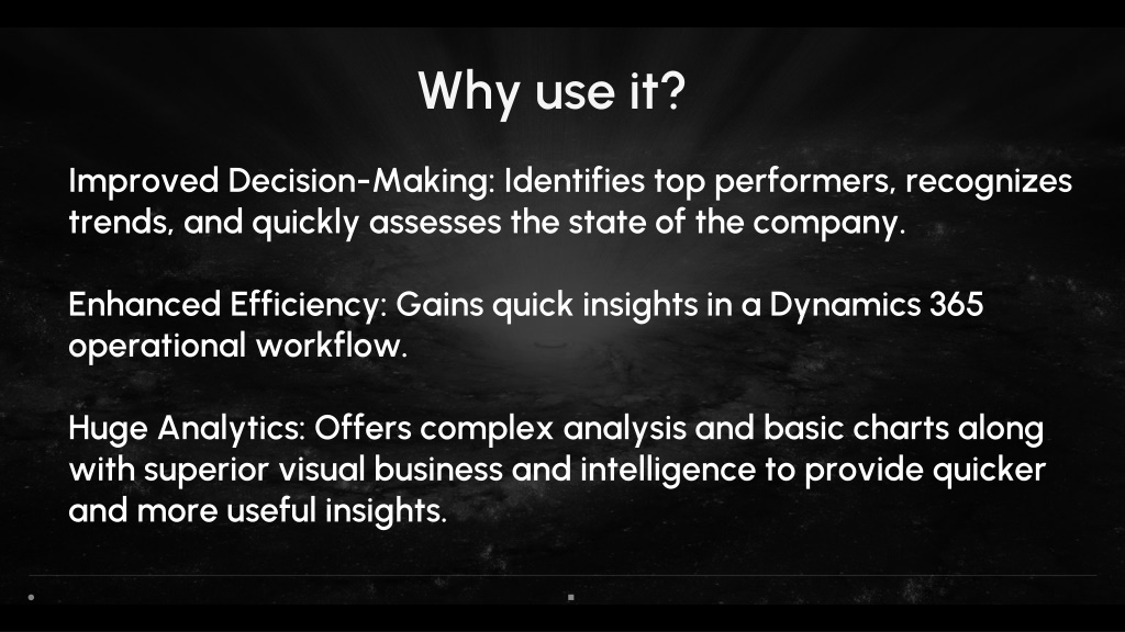 6. Improved Decision-Making: Identifies top performers, recognizes trends, and quickly assesses the state of the company. Enhanced Efficiency: Gains quick insights in a Dynamics 365 operational workflow. Huge Analytics: Offers complex analysis and basic charts along with superior visual business and intelligence to provide quicker and more useful insights. Why use it?