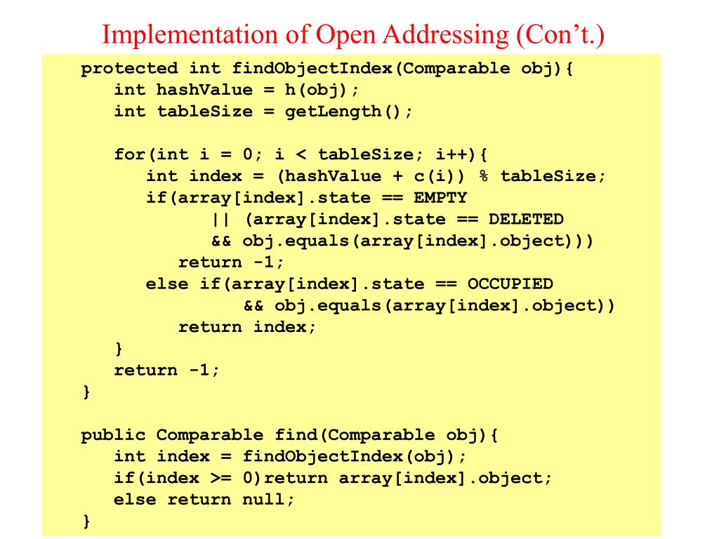 Implementation of Open Addressing (Con’t.) protected int findObjectIndex(Comparable obj){ int hashValue = h(obj); int tableSize = getLength(); for(int i = 0; i < tableSize; i++){ int index = (hashValue + c(i)) % tableSize; if(array[index].state == EMPTY || (array[index].state == DELETED && obj.equals(array[index].object))) return -1; else if(array[index].state == OCCUPIED && obj.equals(array[index].object)) return index; } return -1; } public Comparable find(Comparable obj){ int index = findObjectIndex(obj); if(index >= 0)return array[index].object; else return null; }