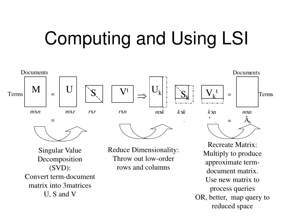 Computing and Using LSI M U Uk Vt S Vkt Sk Þ Recreate Matrix: Multiply to produce approximate term- document matrix. Use new matrix to process queries OR, better, map query to reduced space Reduce Dimensionality: Throw out low-order rows and columns Singular Value Decomposition (SVD): Convert term-document matrix into 3matrices U, S and V