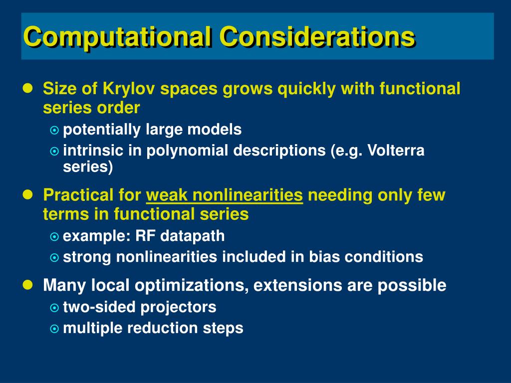 Size of Krylov spaces grows quickly with functional series order potentially large models intrinsic in polynomial descriptions (e.g. Volterra series) Practical for weak nonlinearities needing only few terms in functional series example: RF datapath strong nonlinearities included in bias conditions Many local optimizations, extensions are possible two-sided projectors multiple reduction steps Computational Considerations