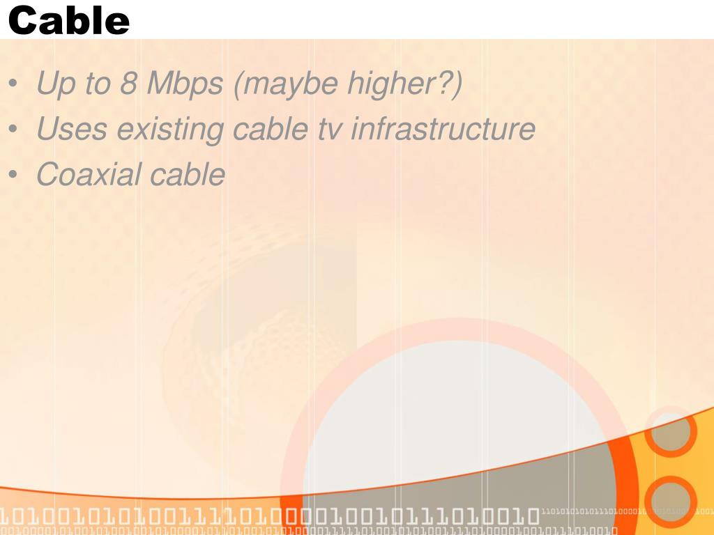 Cable • Up to 8 Mbps (maybe higher?) • Uses existing cable tv infrastructure • Coaxial cable
