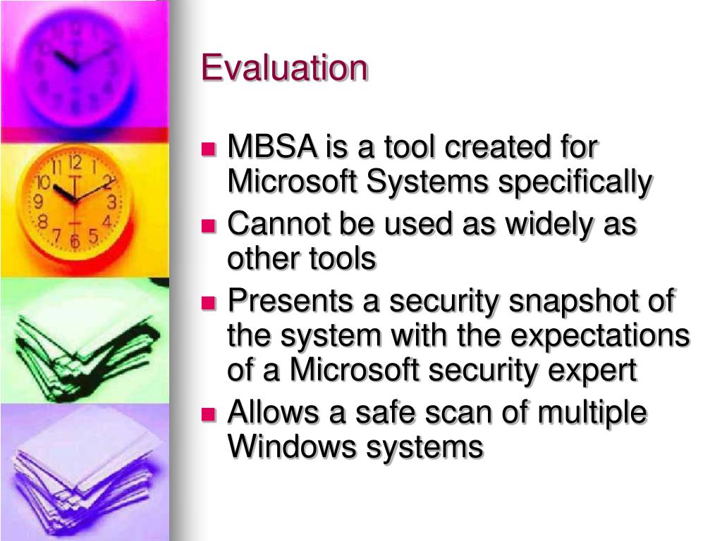 Evaluation • MBSA is a tool created for Microsoft Systems specifically • Cannot be used as widely as other tools • Presents a security snapshot of the system with the expectations of a Microsoft security expert • Allows a safe scan of multiple Windows systems