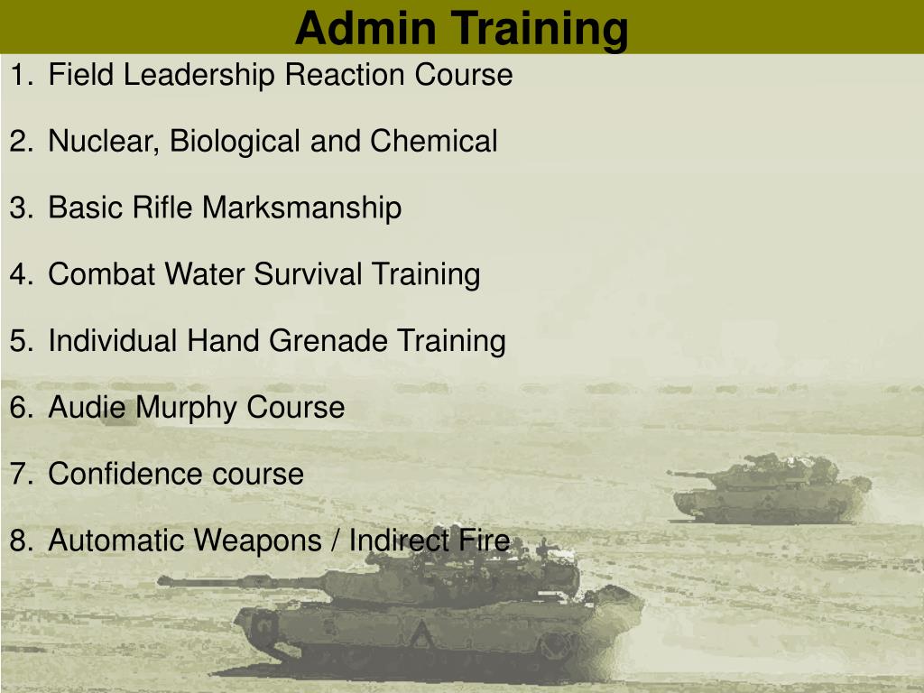 Admin Training • Field Leadership Reaction Course • Nuclear, Biological and Chemical • Basic Rifle Marksmanship • Combat Water Survival Training • Individual Hand Grenade Training • Audie Murphy Course • Confidence course • Automatic Weapons / Indirect Fire