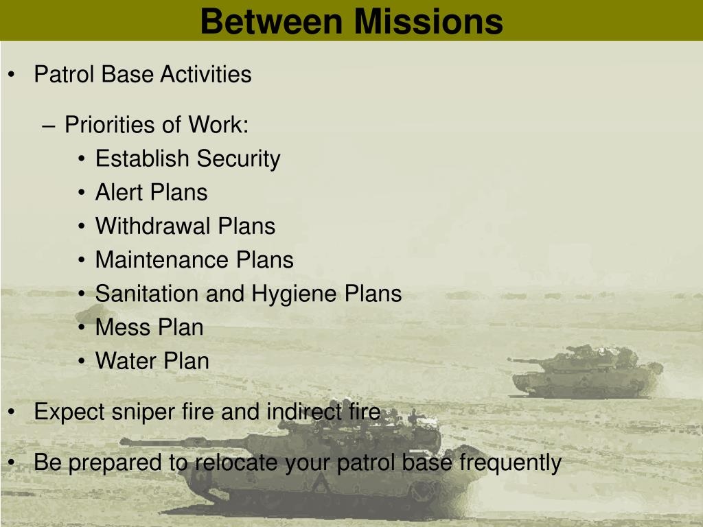 Between Missions • Patrol Base Activities • Priorities of Work: • Establish Security • Alert Plans • Withdrawal Plans • Maintenance Plans • Sanitation and Hygiene Plans • Mess Plan • Water Plan • Expect sniper fire and indirect fire • Be prepared to relocate your patrol base frequently