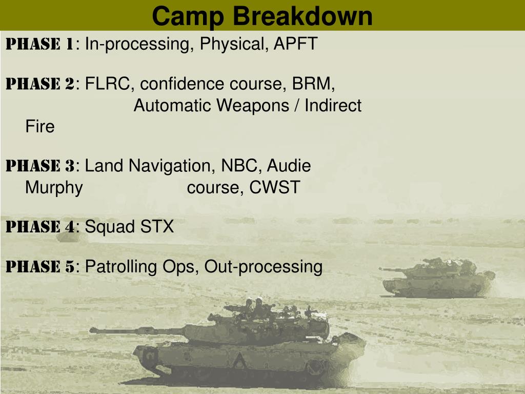 Camp Breakdown • Phase 1: In-processing, Physical, APFT • Phase 2: FLRC, confidence course, BRM, Automatic Weapons / Indirect Fire • Phase 3: Land Navigation, NBC, Audie Murphy course, CWST • Phase 4: Squad STX • Phase 5: Patrolling Ops, Out-processing