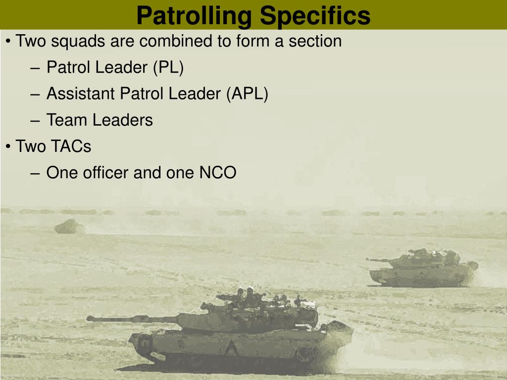 Patrolling Specifics • Two squads are combined to form a section • Patrol Leader (PL) • Assistant Patrol Leader (APL) • Team Leaders • Two TACs • One officer and one NCO