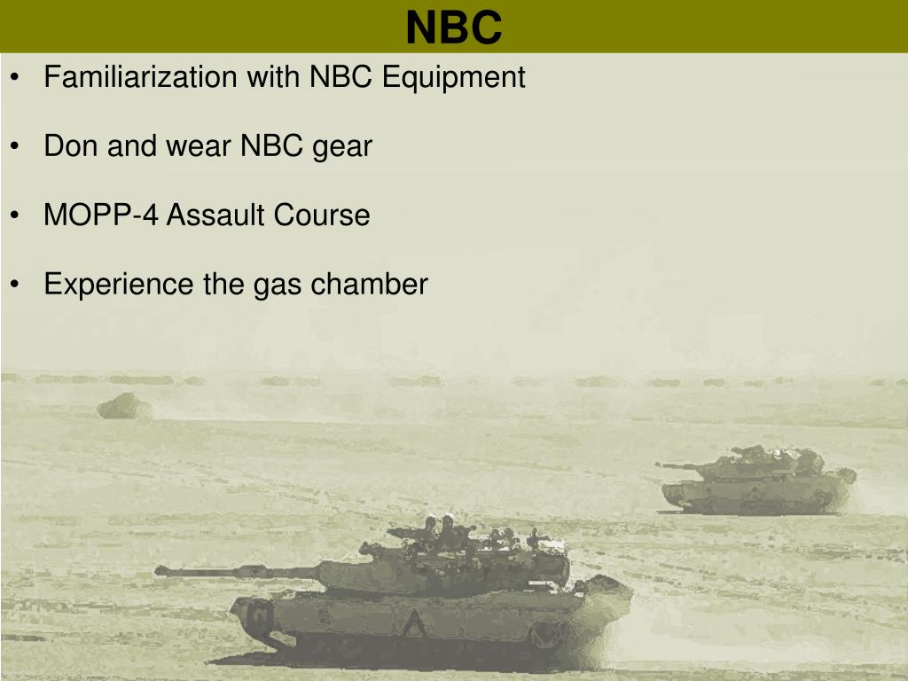 NBC • Familiarization with NBC Equipment • Don and wear NBC gear • MOPP-4 Assault Course • Experience the gas chamber