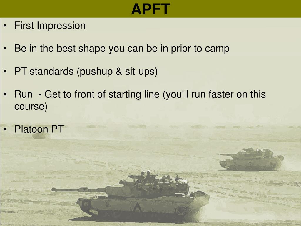 APFT • First Impression • Be in the best shape you can be in prior to camp • PT standards (pushup & sit-ups) • Run - Get to front of starting line (you'll run faster on this course) • Platoon PT
