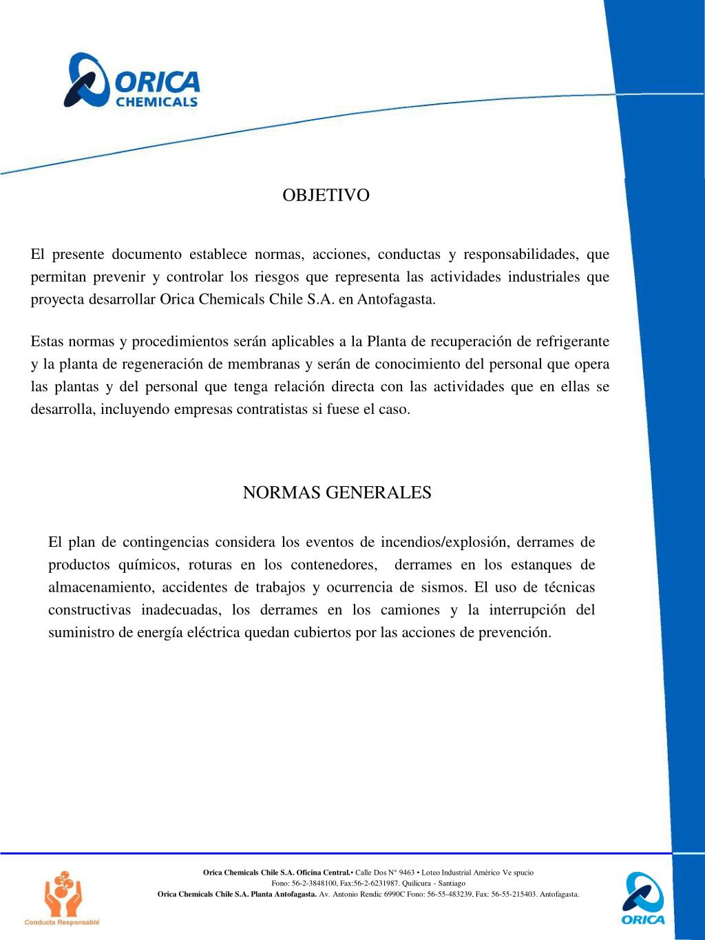 El presente documento establece normas, acciones, conductas y responsabilidades, que permitan prevenir y controlar los riesgos que representa las actividades industriales que proyecta desarrollar Orica Chemicals Chile S.A. en Antofagasta. Estas normas y procedimientos serán aplicables a la Planta de recuperación de refrigerante y la planta de regeneración de membranas y serán de conocimiento del personal que opera las plantas y del personal que tenga relación directa con las actividades que en ellas se desarrolla, incluyendo empresas contratistas si fuese el caso. OBJETIVO NORMAS GENERALES • El plan de contingencias considera los eventos de incendios/explosión, derrames de productos químicos, roturas en los contenedores, derrames en los estanques de almacenamiento, accidentes de trabajos y ocurrencia de sismos. El uso de técnicas constructivas inadecuadas, los derrames en los camiones y la interrupción del suministro de energía eléctrica quedan cubiertos por las acciones de prevención.