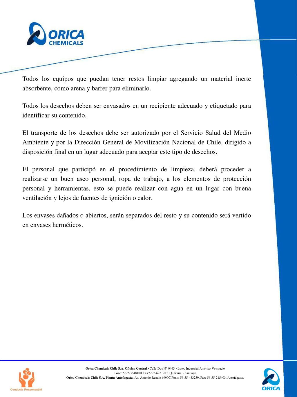 Todos los equipos que puedan tener restos limpiar agregando un material inerte absorbente, como arena y barrer para eliminarlo. Todos los desechos deben ser envasados en un recipiente adecuado y etiquetado para identificar su contenido. El transporte de los desechos debe ser autorizado por el Servicio Salud del Medio Ambiente y por la Dirección General de Movilización Nacional de Chile, dirigido a disposición final en un lugar adecuado para aceptar este tipo de desechos. El personal que participó en el procedimiento de limpieza, deberá proceder a realizarse un buen aseo personal, ropa de trabajo, a los elementos de protección personal y herramientas, esto se puede realizar con agua en un lugar con buena ventilación y lejos de fuentes de ignición o calor. Los envases dañados o abiertos, serán separados del resto y su contenido será vertido en envases herméticos.