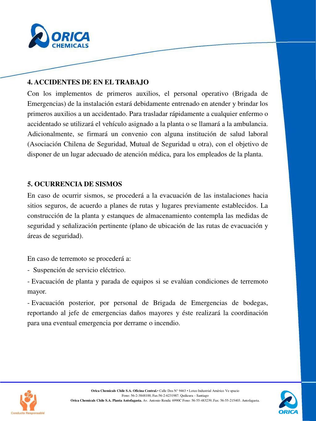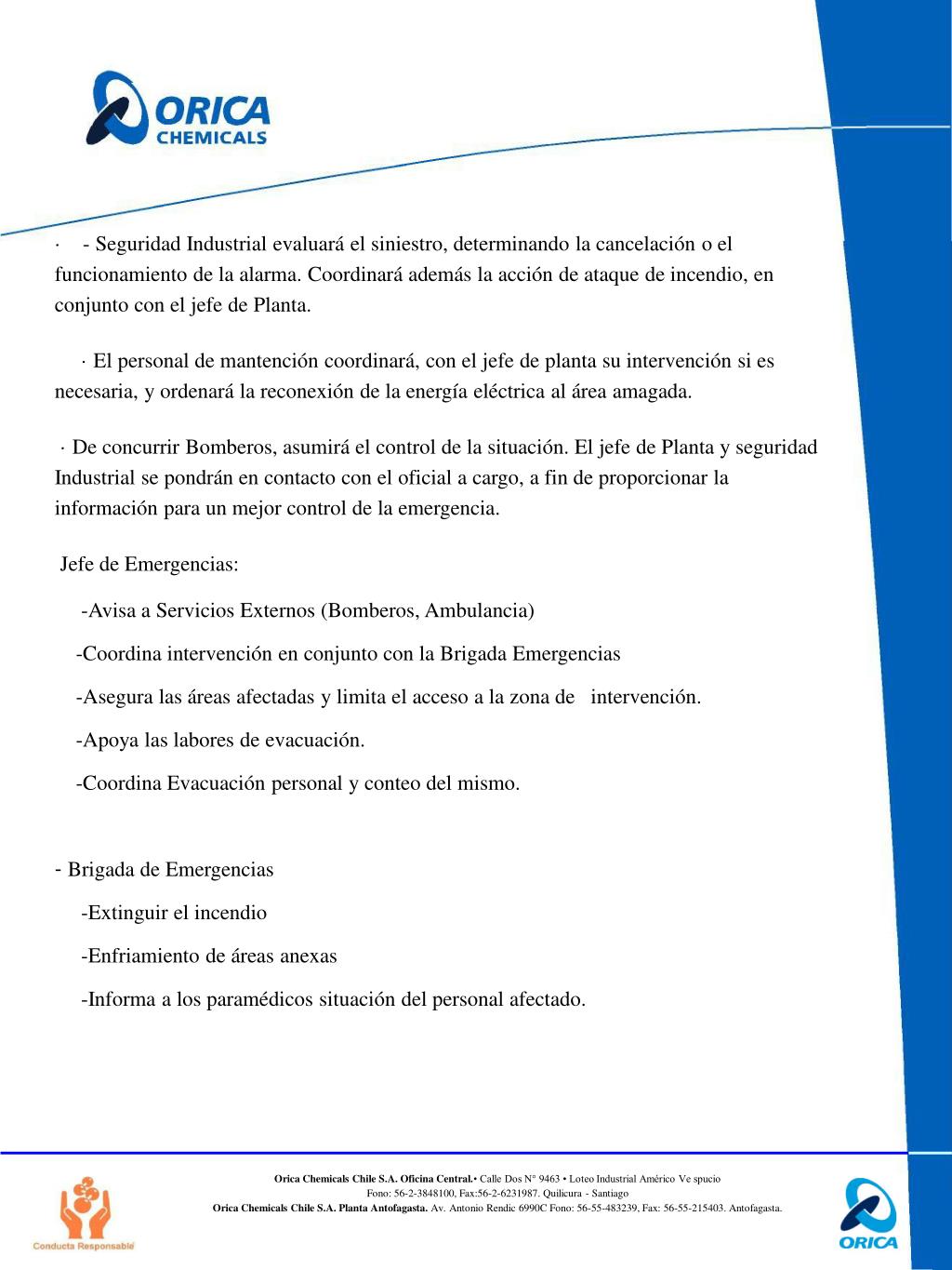 PLAN DE EMERGENCIA PLANTA ANTOFAGASTA. El presente documento establece normas, acciones, conductas y responsabilidades, que permitan prevenir y controlar los riesgos que representa las actividades industriales que proyecta desarrollar Orica Chemicals Chile S.A. en Antofagasta.