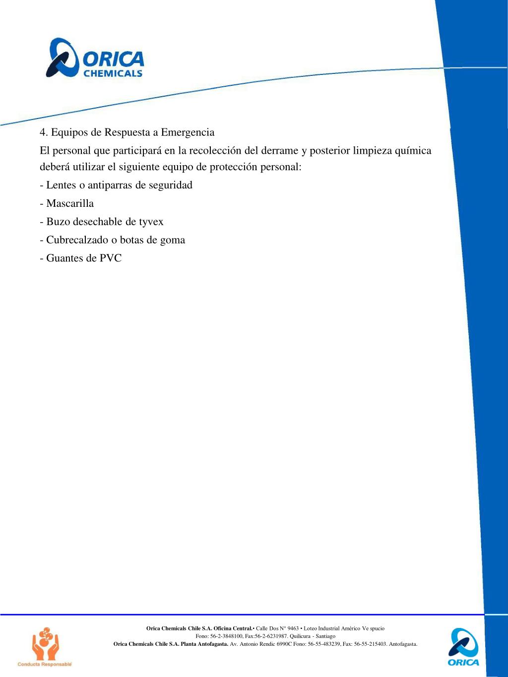 4. Equipos de Respuesta a Emergencia El personal que participará en la recolección del derrame y posterior limpieza química deberá utilizar el siguiente equipo de protección personal: Lentes o antiparras de seguridad Mascarilla Buzo desechable de tyvex Cubrecalzado o botas de goma Guantes de PVC