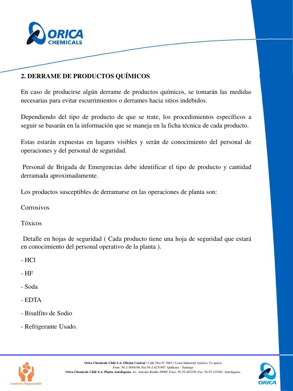 2. DERRAME DE PRODUCTOS QUÍMICOS En caso de producirse algún derrame de productos químicos, se tomarán las medidas necesarias para evitar escurrimientos o derrames hacia sitios indebidos. Dependiendo del tipo de producto de que se trate, los procedimientos específicos a seguir se basarán en la información que se maneja en la ficha técnica de cada producto. Estas estarán expuestas en lugares visibles y serán de conocimiento del personal de operaciones y del personal de seguridad. Personal de Brigada de Emergencias debe identificar el tipo de producto y cantidad derramada aproximadamente. Los productos susceptibles de derramarse en las operaciones de planta son: Corrosivos Tóxicos Detalle en hojas de seguridad ( Cada producto tiene una hoja de seguridad que estará en conocimiento del personal operativo de la planta ). - HCl HF Soda EDTA Bisulfito de Sodio Refrigerante Usado.
