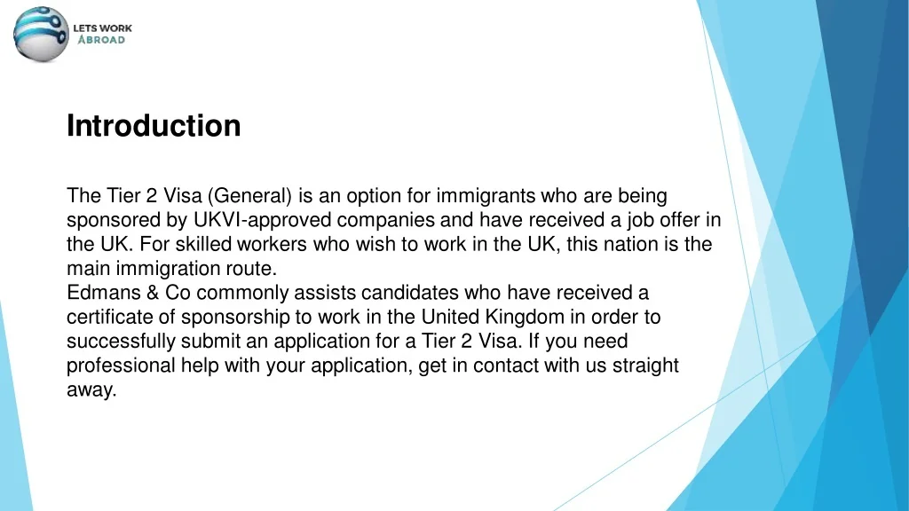 Introduction The Tier 2 Visa (General) is an option for immigrants who are being sponsored by UKVI-approved companies and have received a job offer in the UK. For skilled workers who wish to work in the UK, this nation is the main immigration route. Edmans & Co commonly assists candidates who have received a certificate of sponsorship to work in the United Kingdom in order to successfully submit an application for a Tier 2 Visa. If you need professional help with your application, get in contact with us straight away.