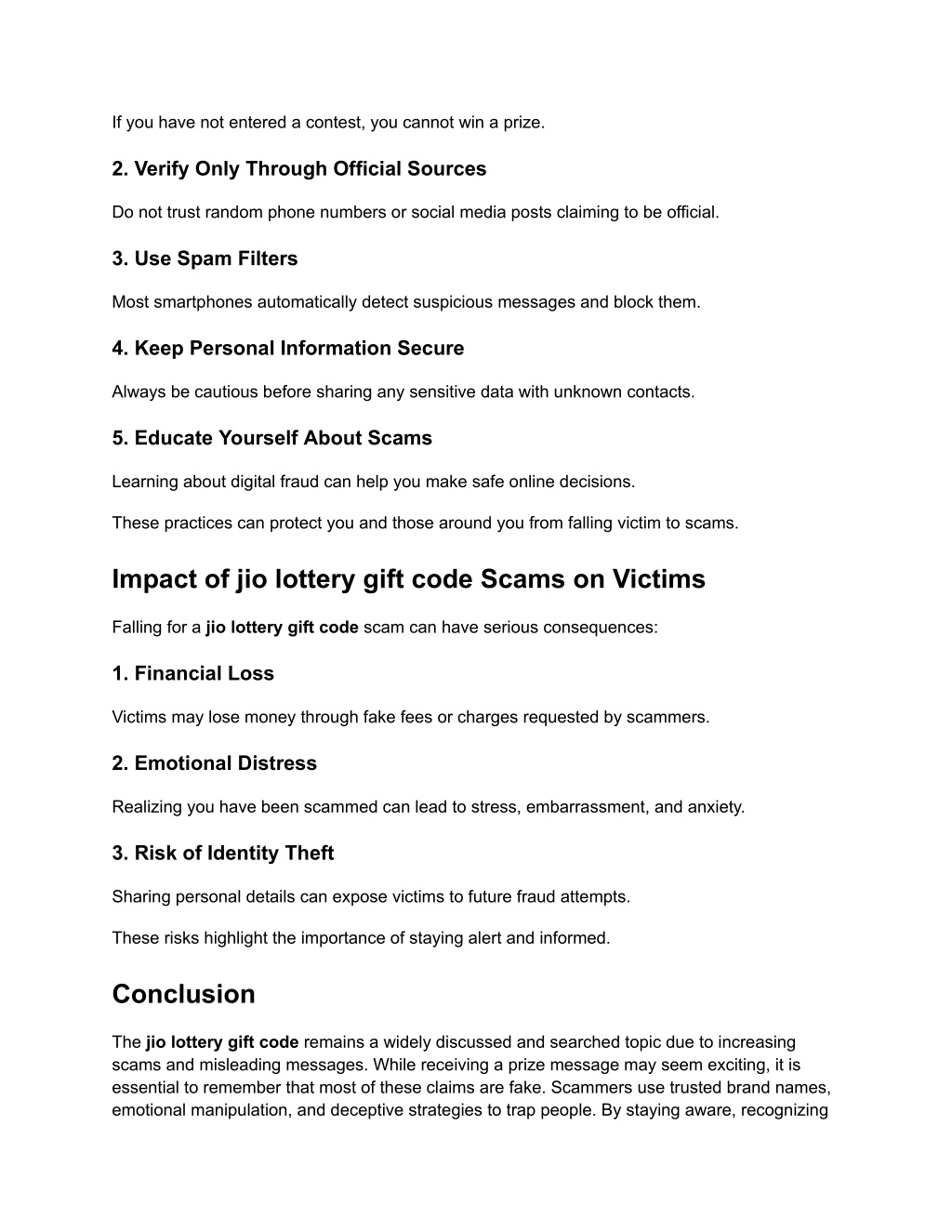 fraud signs, and refusing to share personal information, you can protect yourself from these digital threats. Staying informed is the key to staying safe. Whenever you receive a message claiming you won the jio lottery gift code, follow safety precautions, avoid responding, and stay cautious. Your awareness can also help protect others from falling into similar traps.