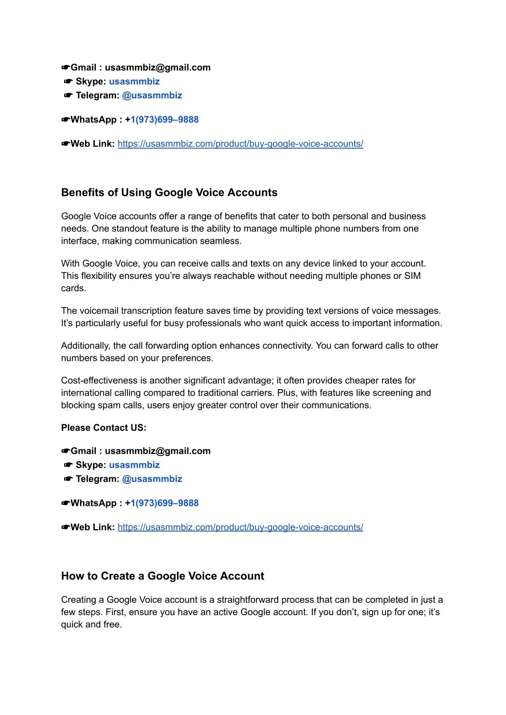 ☛Gmail : usasmmbiz@gmail.com ☛ Skype: usasmmbiz ☛ Telegram: @usasmmbiz ☛WhatsApp : +1(973)699–9888 ☛Web Link: https://usasmmbiz.com/product/buy-google-voice-accounts/ Benefits of Using Google Voice Accounts Google Voice accounts offer a range of benefits that cater to both personal and business needs. One standout feature is the ability to manage multiple phone numbers from one interface, making communication seamless. With Google Voice, you can receive calls and texts on any device linked to your account. This flexibility ensures you’re always reachable without needing multiple phones or SIM cards. The voicemail transcription feature saves time by providing text versions of voice messages. It’s particularly useful for busy professionals who want quick access to important information. Additionally, the call forwarding option enhances connectivity. You can forward calls to other numbers based on your preferences. Cost-effectiveness is another significant advantage; it often provides cheaper rates for international calling compared to traditional carriers. Plus, with features like screening and blocking spam calls, users enjoy greater control over their communications. Please Contact US: ☛Gmail : usasmmbiz@gmail.com ☛ Skype: usasmmbiz ☛ Telegram: @usasmmbiz ☛WhatsApp : +1(973)699–9888 ☛Web Link: https://usasmmbiz.com/product/buy-google-voice-accounts/ How to Create a Google Voice Account Creating a Google Voice account is a straightforward process that can be completed in just a few steps. First, ensure you have an active Google account. If you don’t, sign up for one; it’s quick and free.