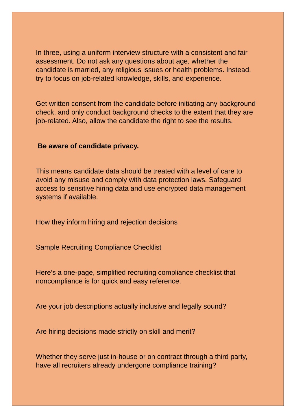 In three, using a uniform interview structure with a consistent and fair assessment. Do not ask any questions about age, whether the candidate is married, any religious issues or health problems. Instead, try to focus on job-related knowledge, skills, and experience. Get written consent from the candidate before initiating any background check, and only conduct background checks to the extent that they are job-related. Also, allow the candidate the right to see the results. Be aware of candidate privacy. This means candidate data should be treated with a level of care to avoid any misuse and comply with data protection laws. Safeguard access to sensitive hiring data and use encrypted data management systems if available. How they inform hiring and rejection decisions Sample Recruiting Compliance Checklist Here’s a one-page, simplified recruiting compliance checklist that noncompliance is for quick and easy reference. Are your job descriptions actually inclusive and legally sound? Are hiring decisions made strictly on skill and merit? Whether they serve just in-house or on contract through a third party, have all recruiters already undergone compliance training?