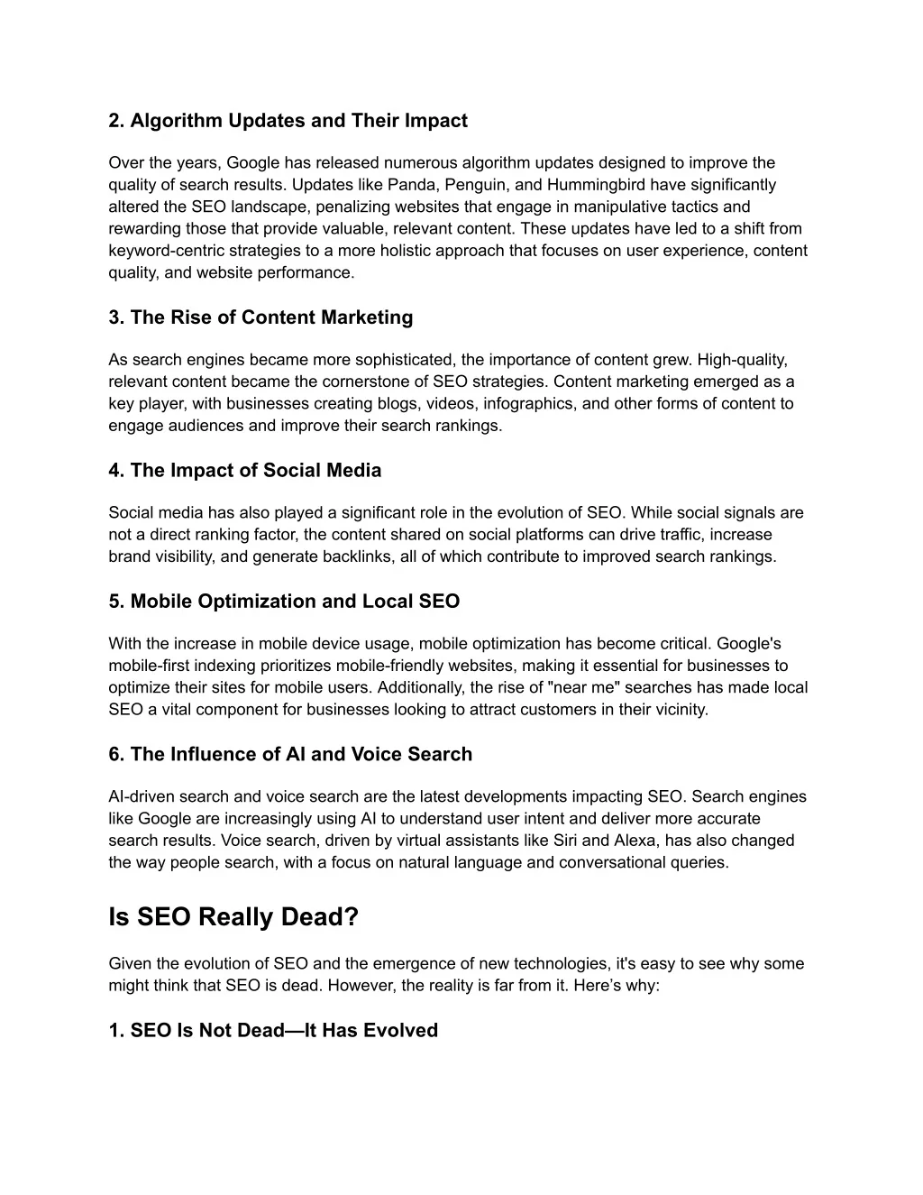 2. Algorithm Updates and Their Impact Over the years, Google has released numerous algorithm updates designed to improve the quality of search results. Updates like Panda, Penguin, and Hummingbird have significantly altered the SEO landscape, penalizing websites that engage in manipulative tactics and rewarding those that provide valuable, relevant content. These updates have led to a shift from keyword-centric strategies to a more holistic approach that focuses on user experience, content quality, and website performance. 3. The Rise of Content Marketing As search engines became more sophisticated, the importance of content grew. High-quality, relevant content became the cornerstone of SEO strategies. Content marketing emerged as a key player, with businesses creating blogs, videos, infographics, and other forms of content to engage audiences and improve their search rankings. 4. The Impact of Social Media Social media has also played a significant role in the evolution of SEO. While social signals are not a direct ranking factor, the content shared on social platforms can drive traffic, increase brand visibility, and generate backlinks, all of which contribute to improved search rankings. 5. Mobile Optimization and Local SEO With the increase in mobile device usage, mobile optimization has become critical. Google's mobile-first indexing prioritizes mobile-friendly websites, making it essential for businesses to optimize their sites for mobile users. Additionally, the rise of "near me" searches has made local SEO a vital component for businesses looking to attract customers in their vicinity. 6. The Influence of AI and Voice Search AI-driven search and voice search are the latest developments impacting SEO. Search engines like Google are increasingly using AI to understand user intent and deliver more accurate search results. Voice search, driven by virtual assistants like Siri and Alexa, has also changed the way people search, with a focus on natural language and conversational queries. Is SEO Really Dead? Given the evolution of SEO and the emergence of new technologies, it's easy to see why some might think that SEO is dead. However, the reality is far from it. Here’s why: 1. SEO Is Not Dead—It Has Evolved
