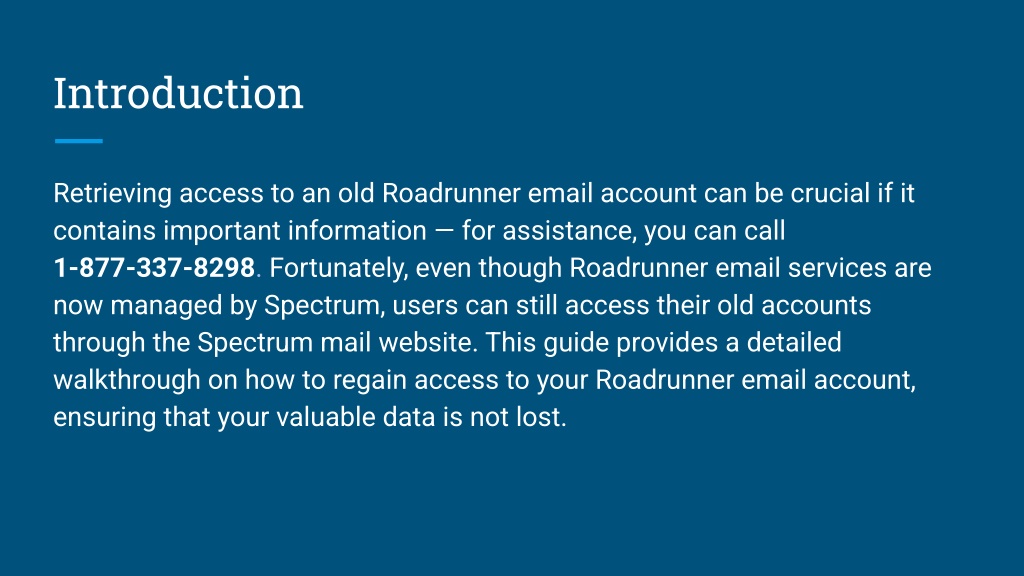 Introduction Retrieving access to an old Roadrunner email account can be crucial if it contains important information — for assistance, you can call 1-877-337-8298. Fortunately, even though Roadrunner email services are now managed by Spectrum, users can still access their old accounts through the Spectrum mail website. This guide provides a detailed walkthrough on how to regain access to your Roadrunner email account, ensuring that your valuable data is not lost.