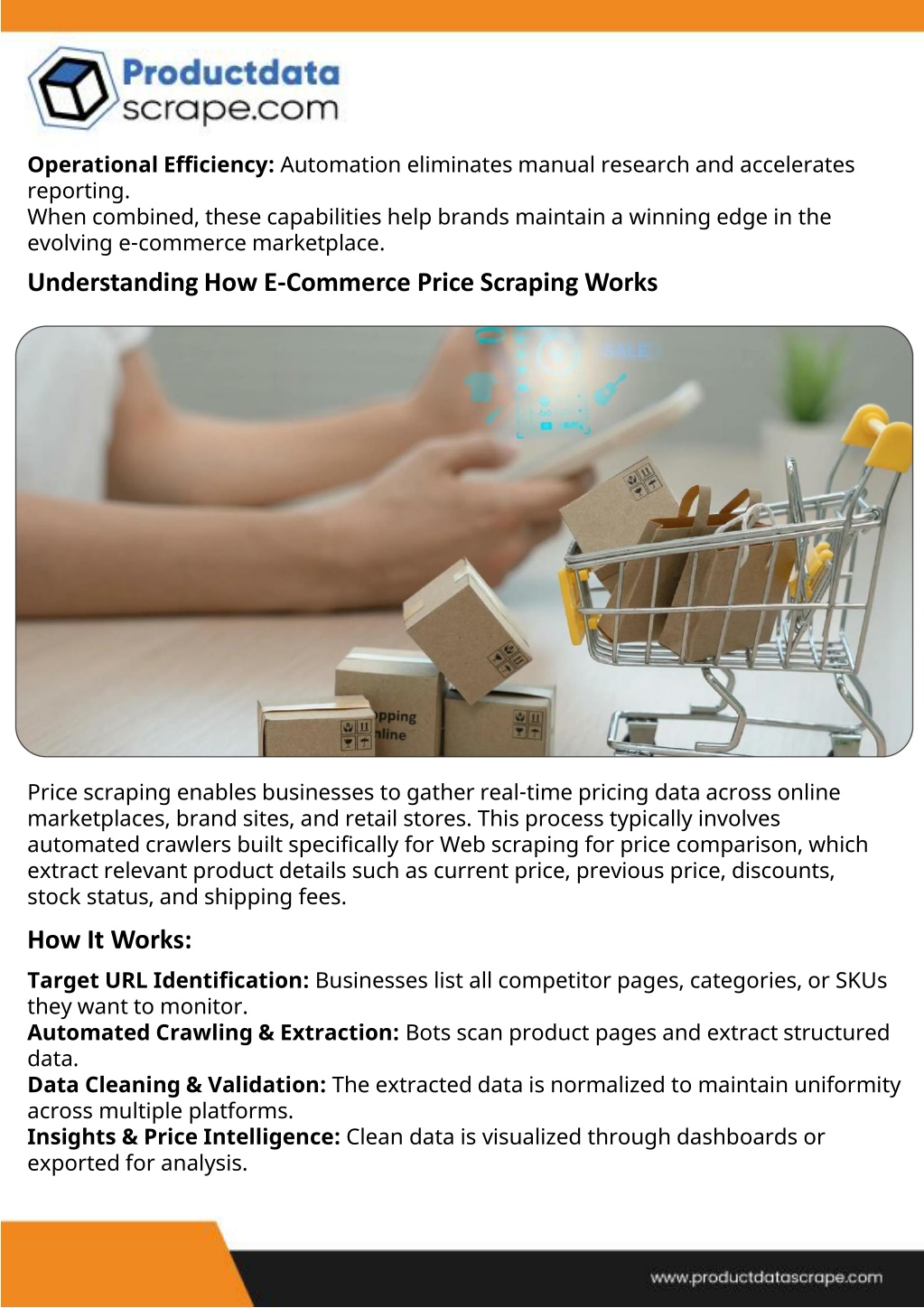 Operational Efficiency: Automation eliminates manual research and accelerates reporting. When combined, these capabilities help brands maintain a winning edge in the evolving e-commerce marketplace. Understanding How E-Commerce Price Scraping Works Price scraping enables businesses to gather real-time pricing data across online marketplaces, brand sites, and retail stores. This process typically involves automated crawlers built specifically for Web scraping for price comparison, which extract relevant product details such as current price, previous price, discounts, stock status, and shipping fees. How It Works: Target URL Identification: Businesses list all competitor pages, categories, or SKUs they want to monitor. Automated Crawling & Extraction: Bots scan product pages and extract structured data. Data Cleaning & Validation: The extracted data is normalized to maintain uniformity across multiple platforms. Insights & Price Intelligence: Clean data is visualized through dashboards or exported for analysis.