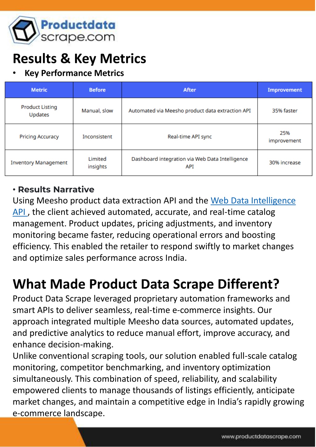 7. Results & Key Metrics • Key Performance Metrics • Results Narrative • Using Meesho product data extraction API and the Web Data Intelligence API , the client achieved automated, accurate, and real-time catalog management. Product updates, pricing adjustments, and inventory monitoring became faster, reducing operational errors and boosting efficiency. This enabled the retailer to respond swiftly to market changes and optimize sales performance across India. • What Made Product Data Scrape Different? • Product Data Scrape leveraged proprietary automation frameworks and smart APIs to deliver seamless, real-time e-commerce insights. Our approach integrated multiple Meesho data sources, automated updates, and predictive analytics to reduce manual effort, improve accuracy, and enhance decision-making. • Unlike conventional scraping tools, our solution enabled full-scale catalog monitoring, competitor benchmarking, and inventory optimization simultaneously. This combination of speed, reliability, and scalability empowered clients to manage thousands of listings efficiently, anticipate market changes, and maintain a competitive edge in India’s rapidly growing e-commerce landscape.